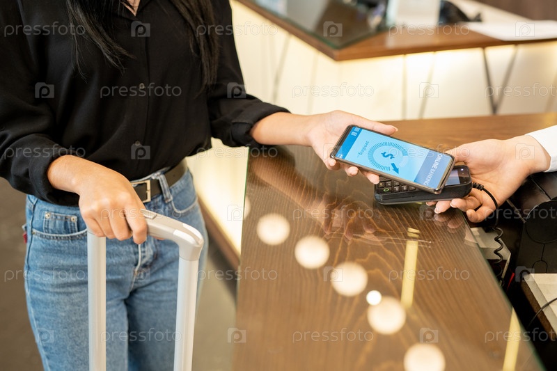 Молодая женщина платит за номер в отеле с помощью смартфона