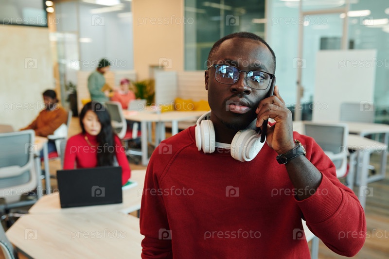 Молодой серьезный бизнесмен или дизайнер африканской этнической принадлежности разговаривает со смартфоном