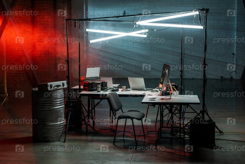 Столы, ноутбуки, лампы и стул в офисе