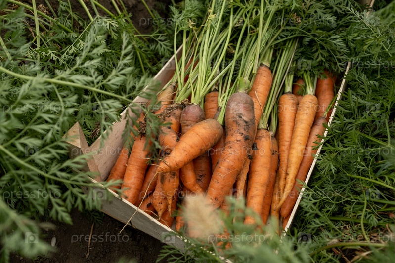 Куча свежих морков в деревянной коробке, стоящей на земле