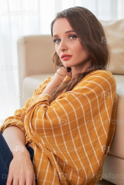 Портрет брюнетной женщины, сидящей на диване