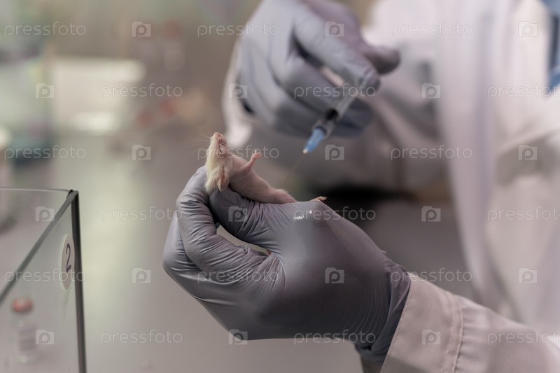 Перчатки рук ученого, который собирается сделать инъекцию белой мыши