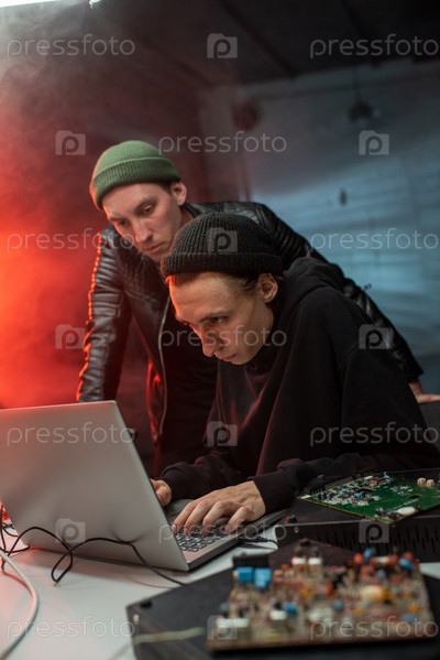 Два мужчины, склонившиеся над ноутбуком в темном офисе
