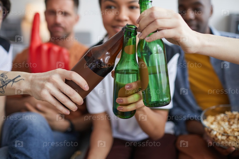 Молодые люди пьют пиво дома Close Up