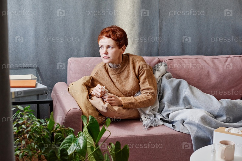 Горизонтальный снимок зрелой женщины с короткими волосами, чувствующей себя плохо, держащей бумажный салфетку, отдыхающей на диване дома и оглядывающейся в сторону