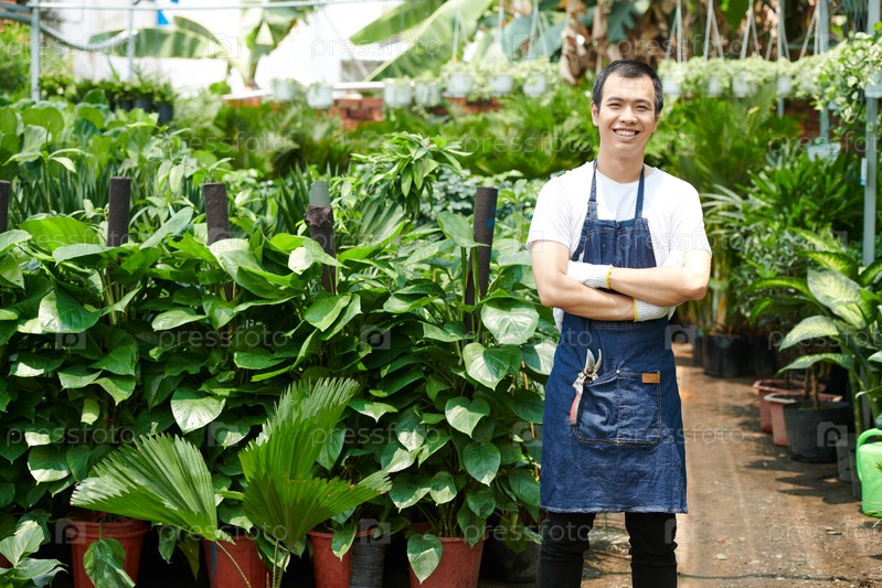 Счастливый человек, работающий в теплице