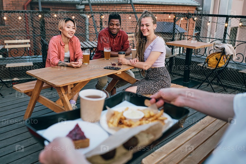 Трое межкультурных друзей смотрят на официанта, несущего поднос с едой и напитками