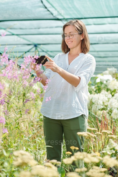 Улыбающаяся зрелая женщина в очках и белой рубашке, держащая смартфон над розовыми цветами