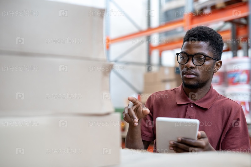 Молодой африканский мужчина с цифровым планшетом смотрит на кучу коробок