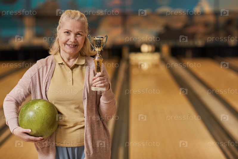 Старшая женщина держит боулинговый мяч и трофей
