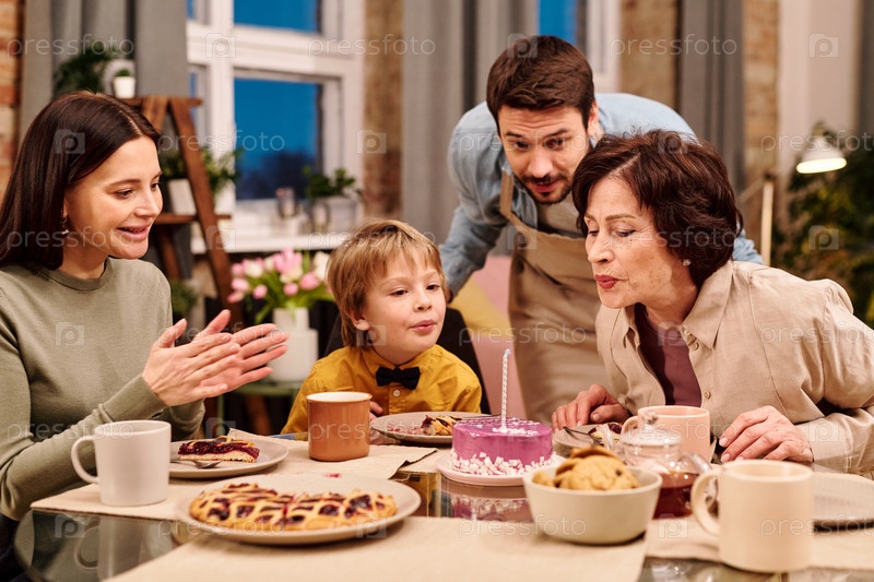 Зрелая женщина и ее внук дуют свечу на рождественский торт