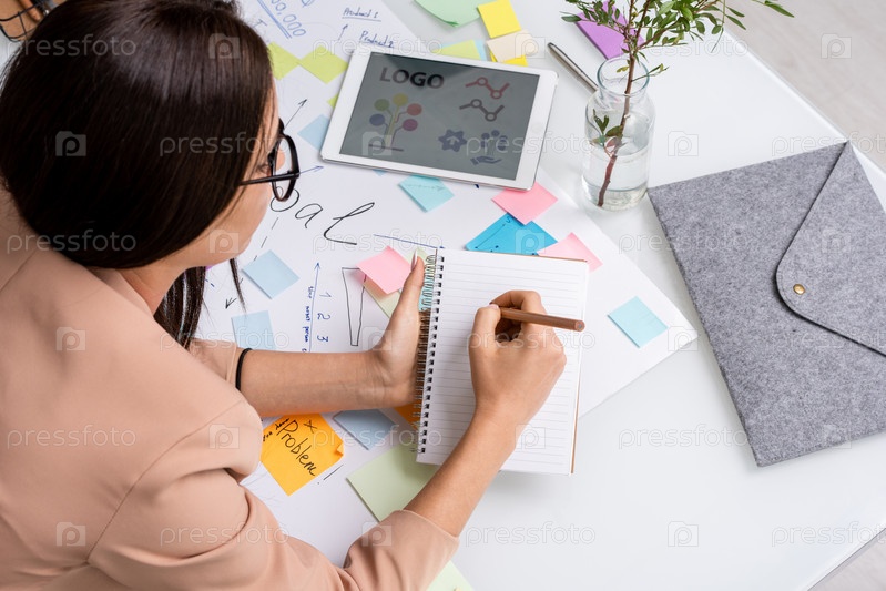 Молодая брюнетка-бизнесменка склоняется над большим документом с основными целями
