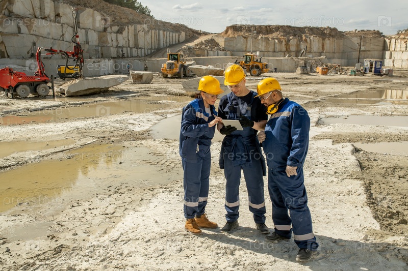 Три строителя обсуждают эскиз здания в табличке