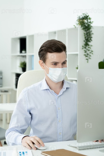 Молодой серьезный дизайнер с защитной маской на лице смотрит на компьютерный экран