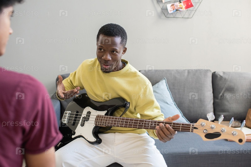 Африканский мужчина в повседневной одежде объясняет студенту, как играть на гитаре