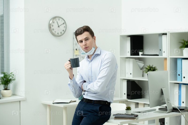 Молодой современный бизнесмен с чашкой чая или кофе стоит у рабочего места