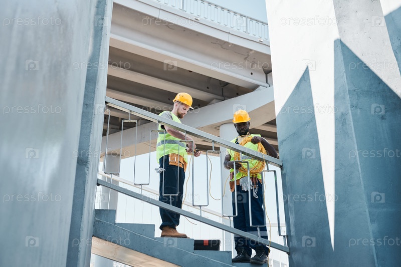 Рабочие, обсуждающие строительные работы