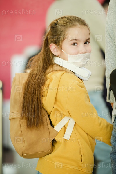 Милая маленькая путешественница с рюкзаком, поворачивающая голову назад, смотря на тебя из очереди