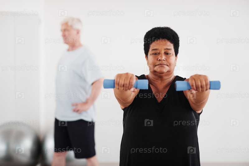 Женщина занимается упражнениями с гантеликами в студии