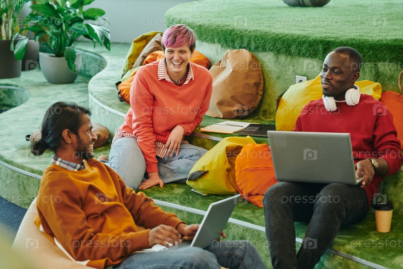 Молодые межкультурные менеджеры слушают творческую деловую женщину на встрече