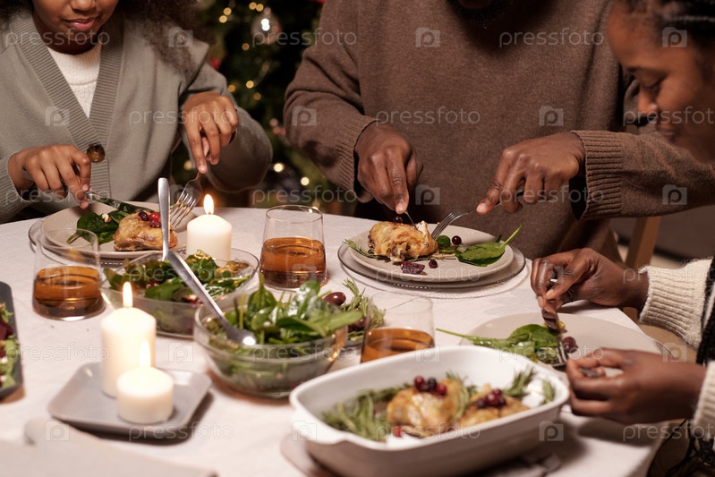 Руки членов семьи, режущих мясо на своих тарелках