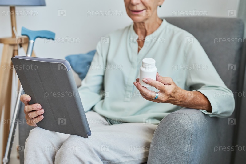 Женщина, держащая рецептурные таблетки Senior