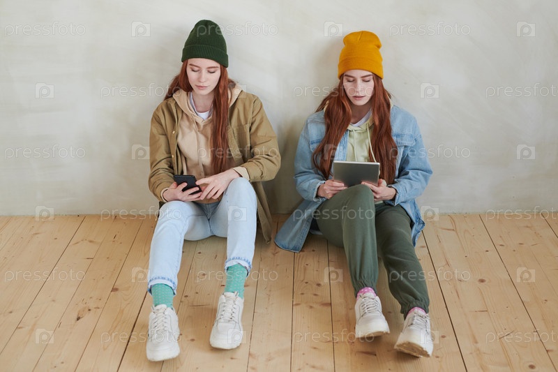 Женские близнецы сидят на деревянном полу