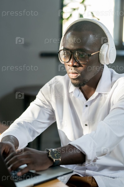 Серьезный мужчина африканской этнической принадлежности использует ноутбук во время анализа данных