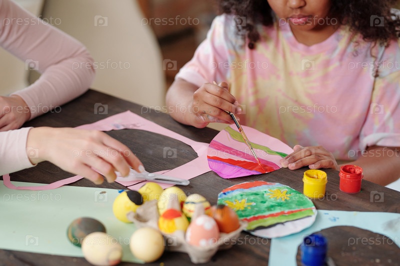 Серьезная смешанная раса маленькая девочка с щеткой, рисующая пасхальное яйцо у стола