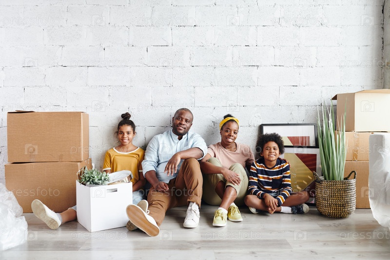 Африканская семья с отцом, матерью и двумя детьми в повседневной одежде сидит у белой покрашенной стены