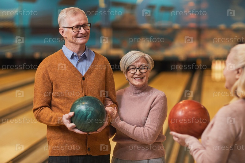 Счастливая старшая пара на боулинговой аллее