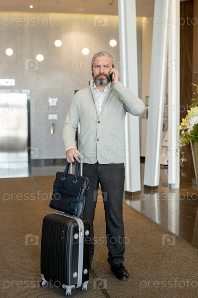 Зрелый бизнесмен с чемоданом разговаривает по мобильному телефону