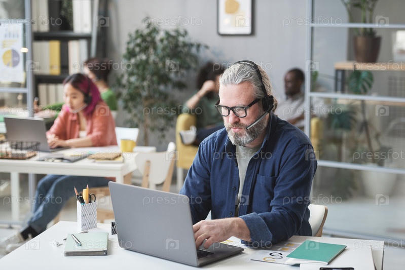 Зрелый мужчина работает в колл-центре