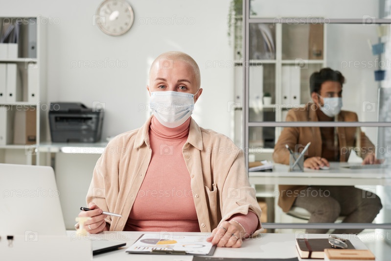 Портрет женщины в маске для лица, анализирующей статистические документы во время работы в офисе во время пандемии