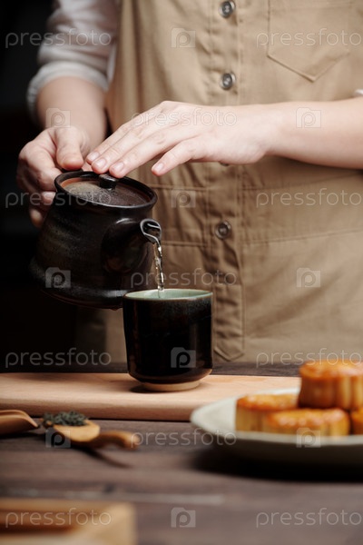 Человек, наливающий зеленый чай в чашку