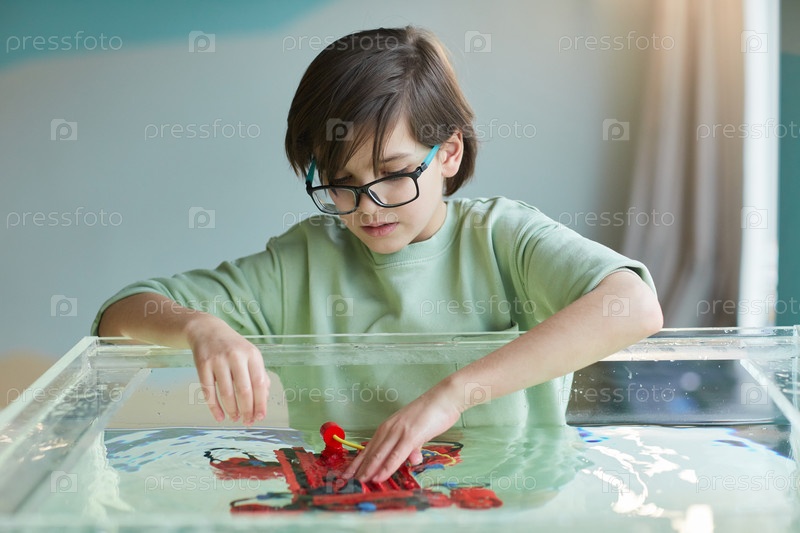 Мальчик, играющий с водяным роботом