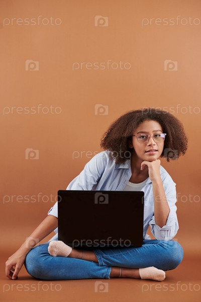 Девушка с афро прической сидит с ноутбуком