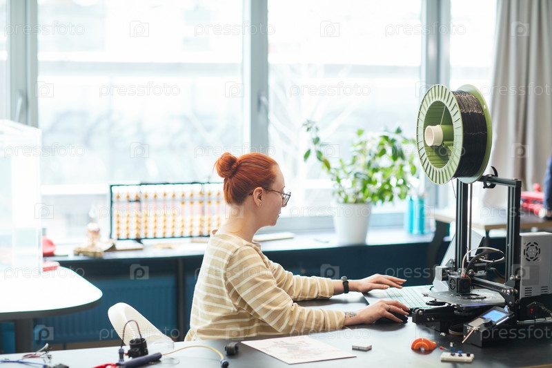 Молодая женщина, использующая 3D-принтер Side View