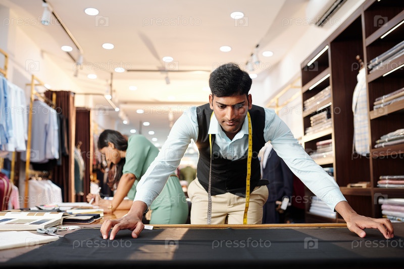 Tailor, измеряющий ткань из черной шерсти