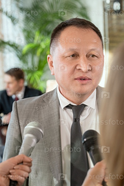 Зрелый азиатский мужчина-делегат в формальной одежде стоит перед журналистами