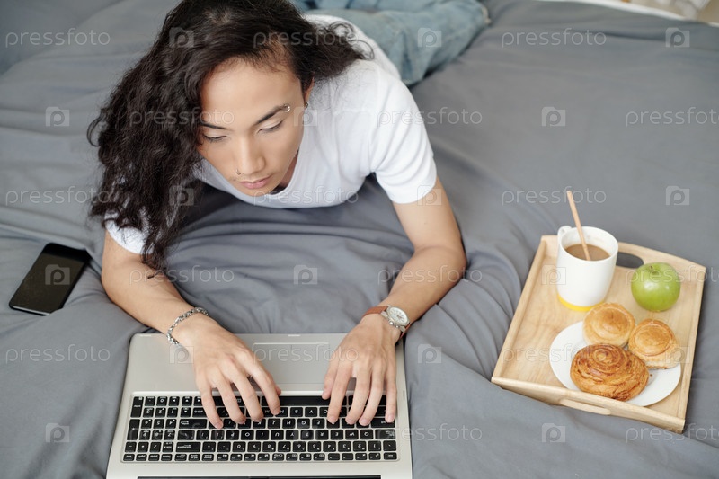 Съедающий завтрак в постели мужчина