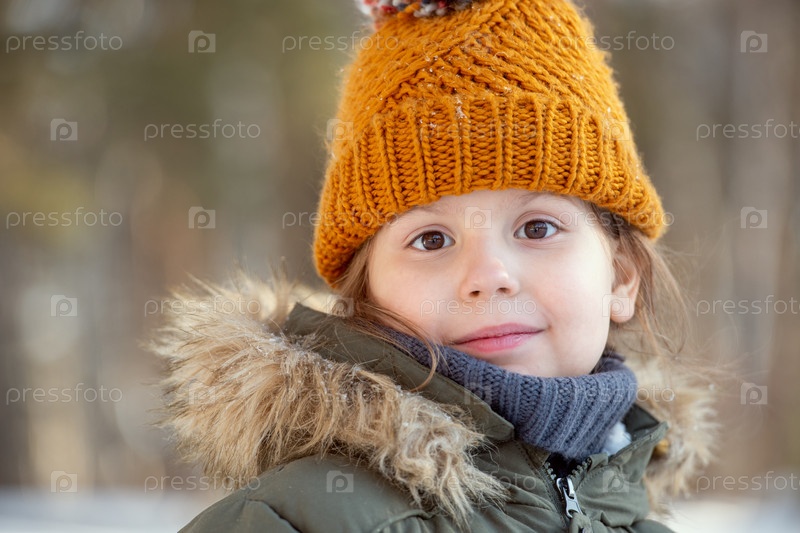 Милая девочка в теплой куртке и вязанной шапочке смотрит на тебя с улыбкой