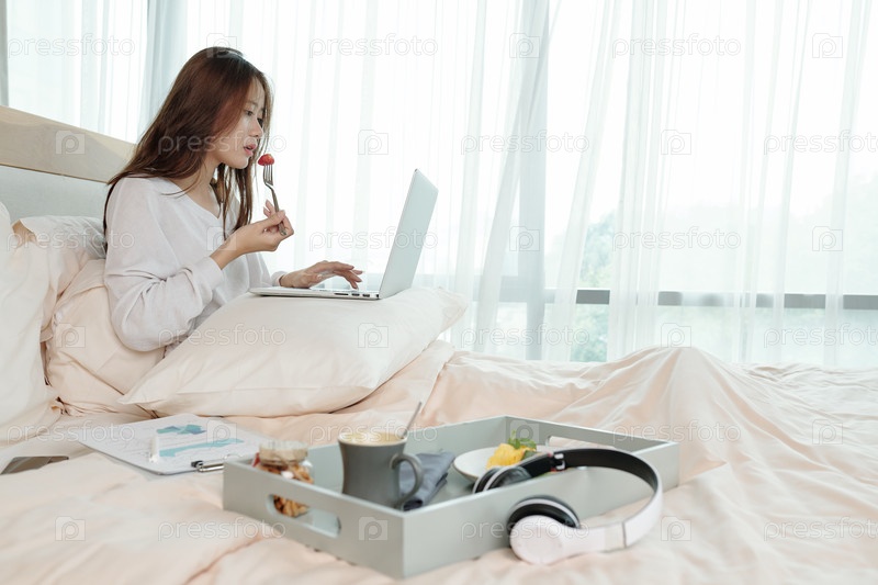 Деловая женщина, работающая в постели