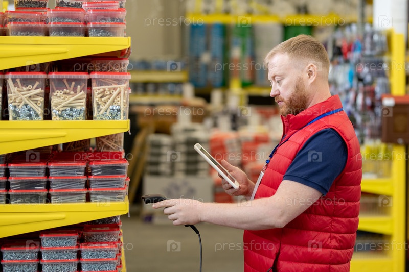 Прохожий в магазине с планшетом, используя сканер во время проверки цен
