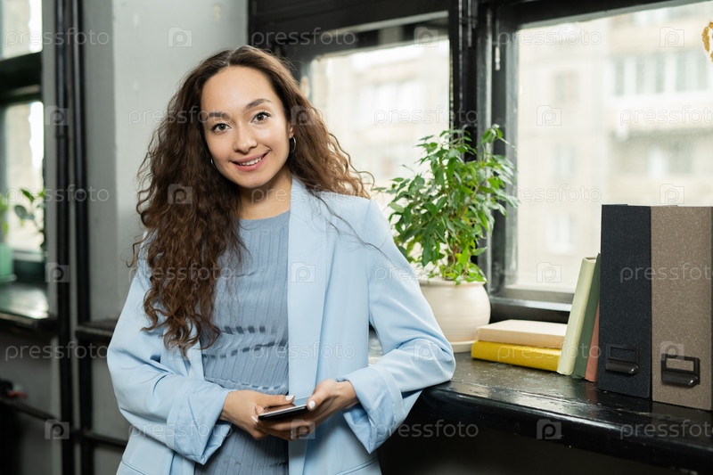 Счастливая молодая бизнесвумен с длинными темными волнистыми волосами
