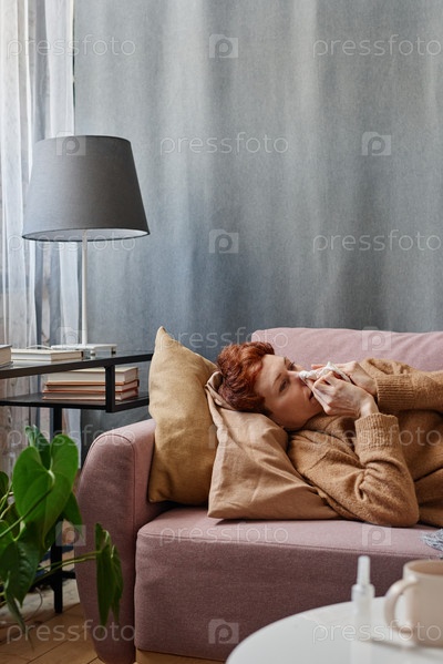 Вертикальный снимок женщины с гриппом, которая лежит на диване дома и дует себе в нос