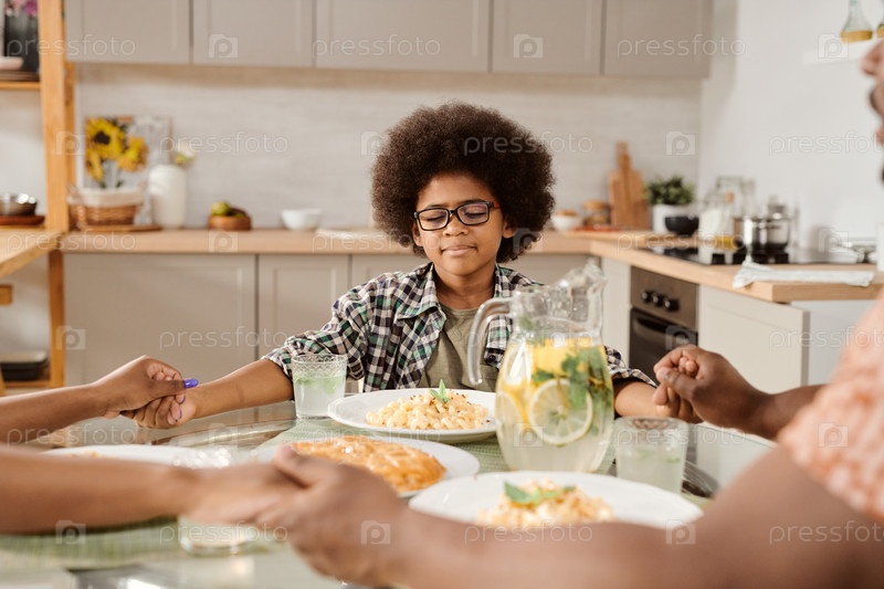 Милый мальчик с закрытыми глазами, держащийся за руки родителей во время молитвы