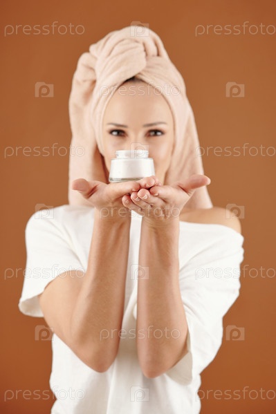 Молодая женщина показывает кремовый горшок