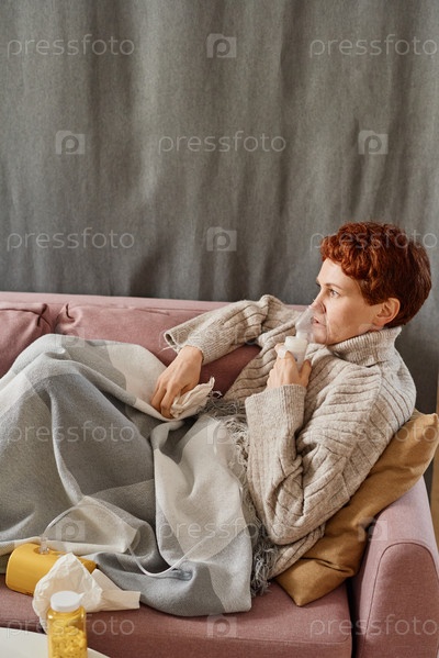 Вертикальный высокоугольный снимок зрелой женщины, страдающей гриппом, которая сидит дома и отдыхает на диване с помощью небулайзера