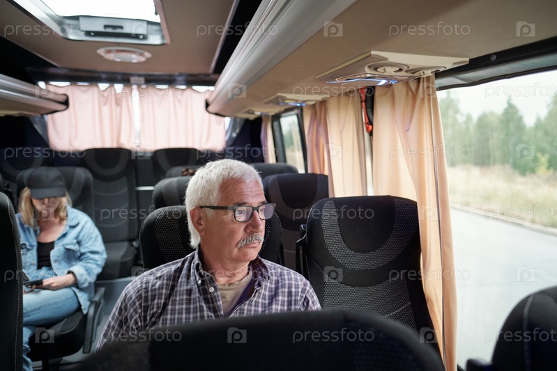 Серьезный пожилой мужчина в очках сидит у окна внутри автобуса